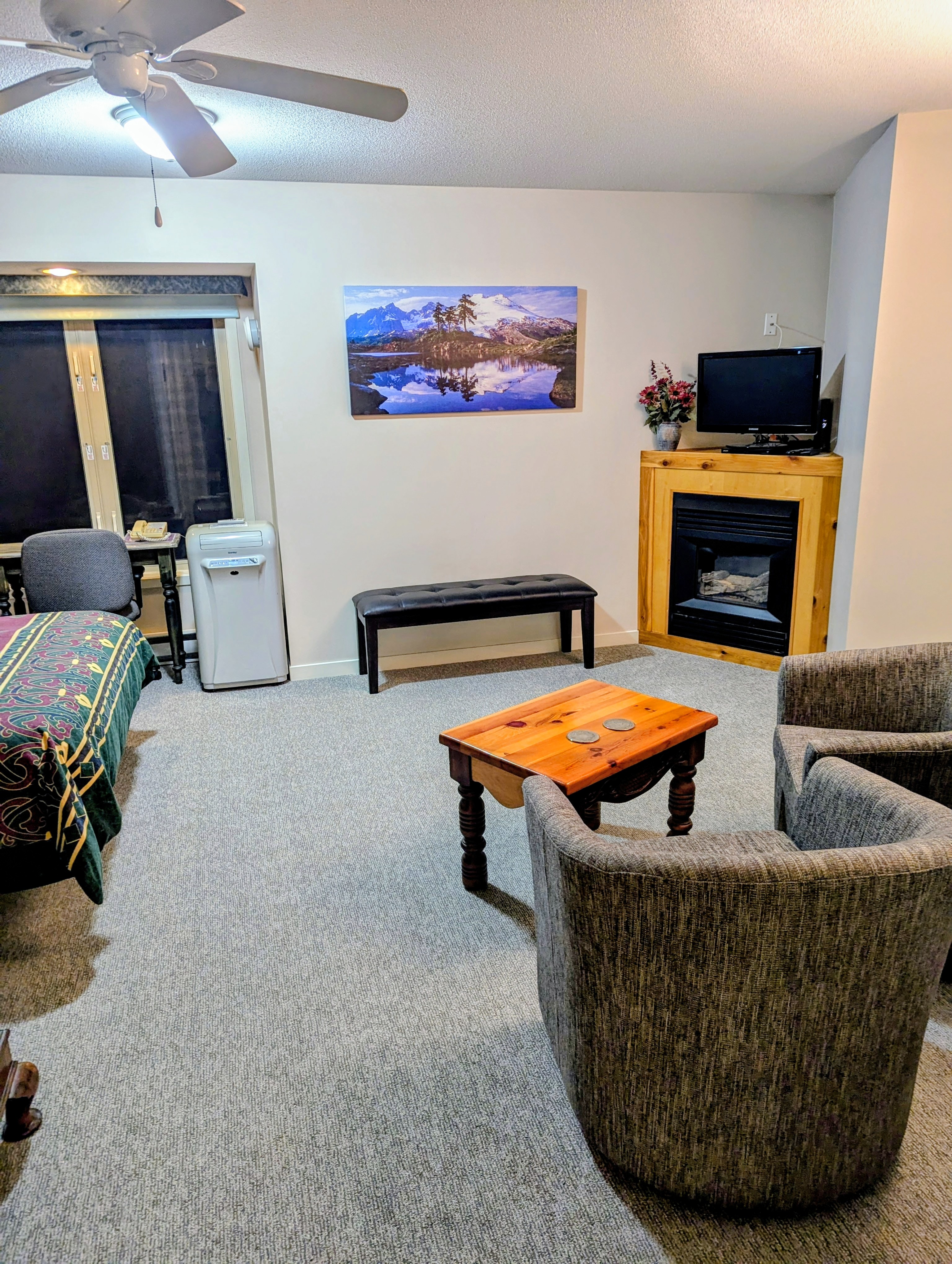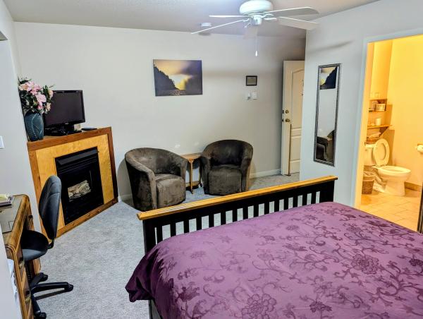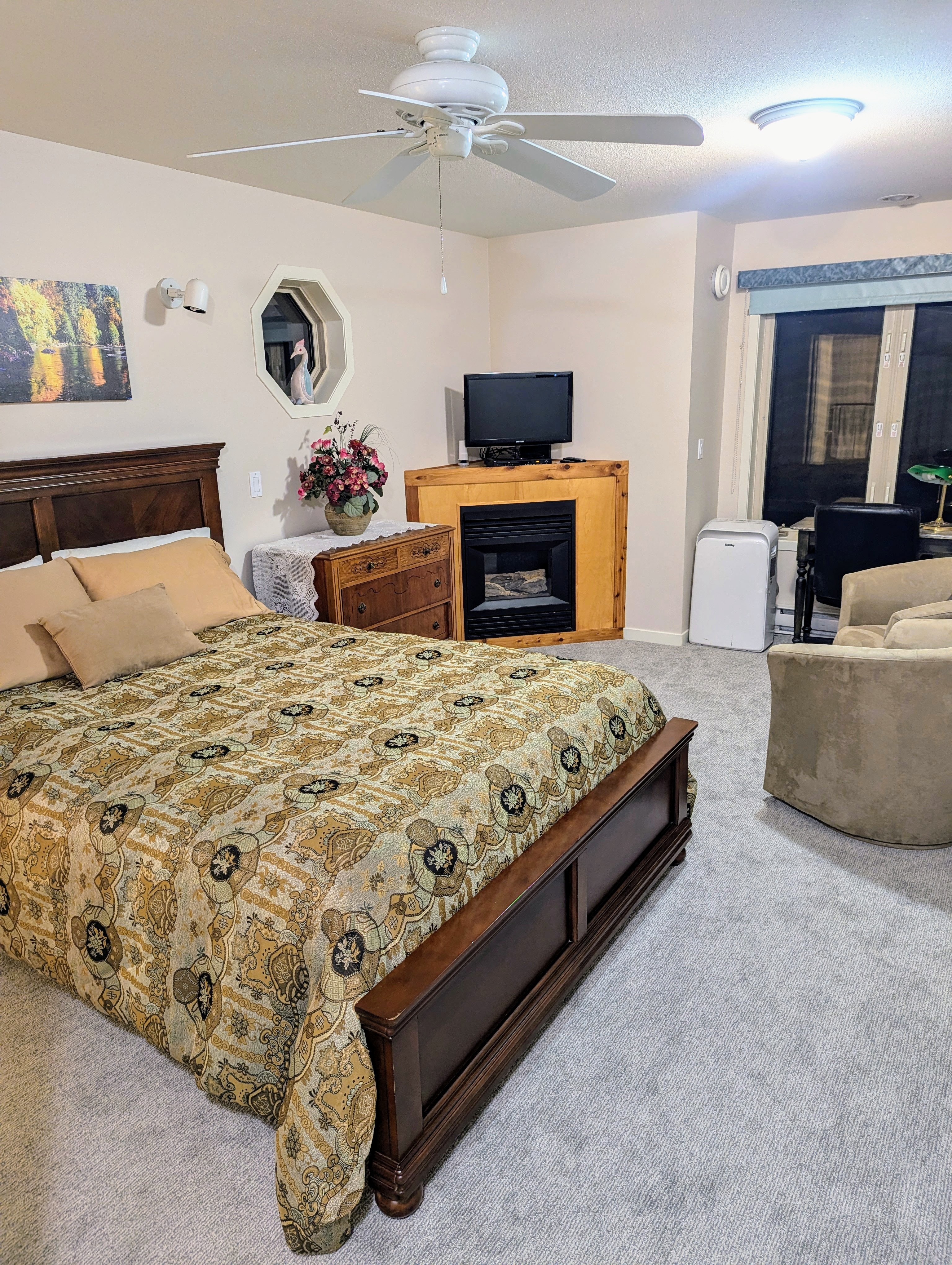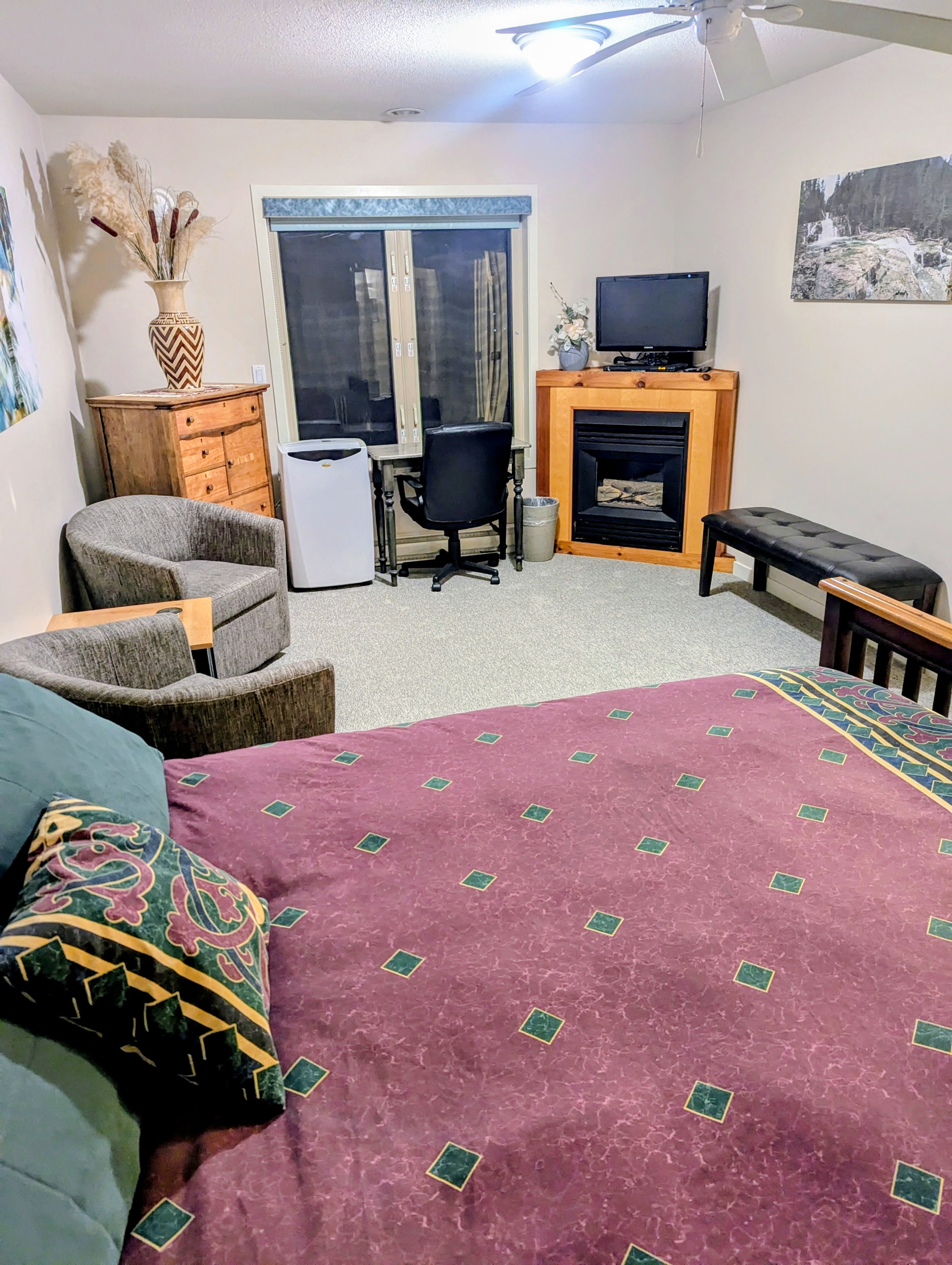 1 Queen Bed adorned in a goose-down duvet.  30inch Flatscreen HDTV with free DVD movies. Cozy natural gas fireplace and deluxe air-conditioning. Steno desk with Free High-Speed Wireless Internet.