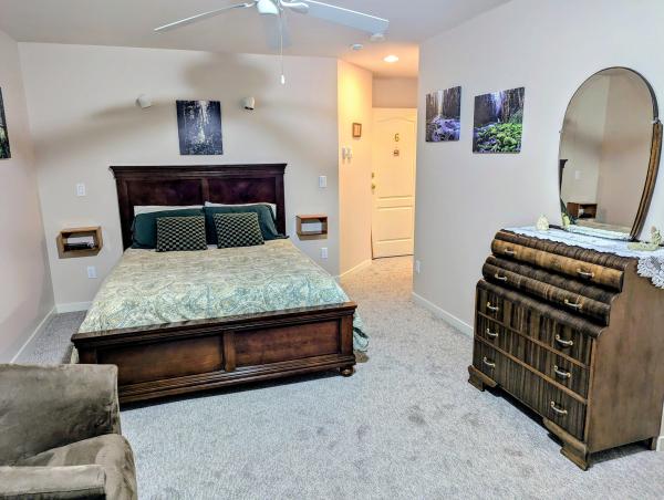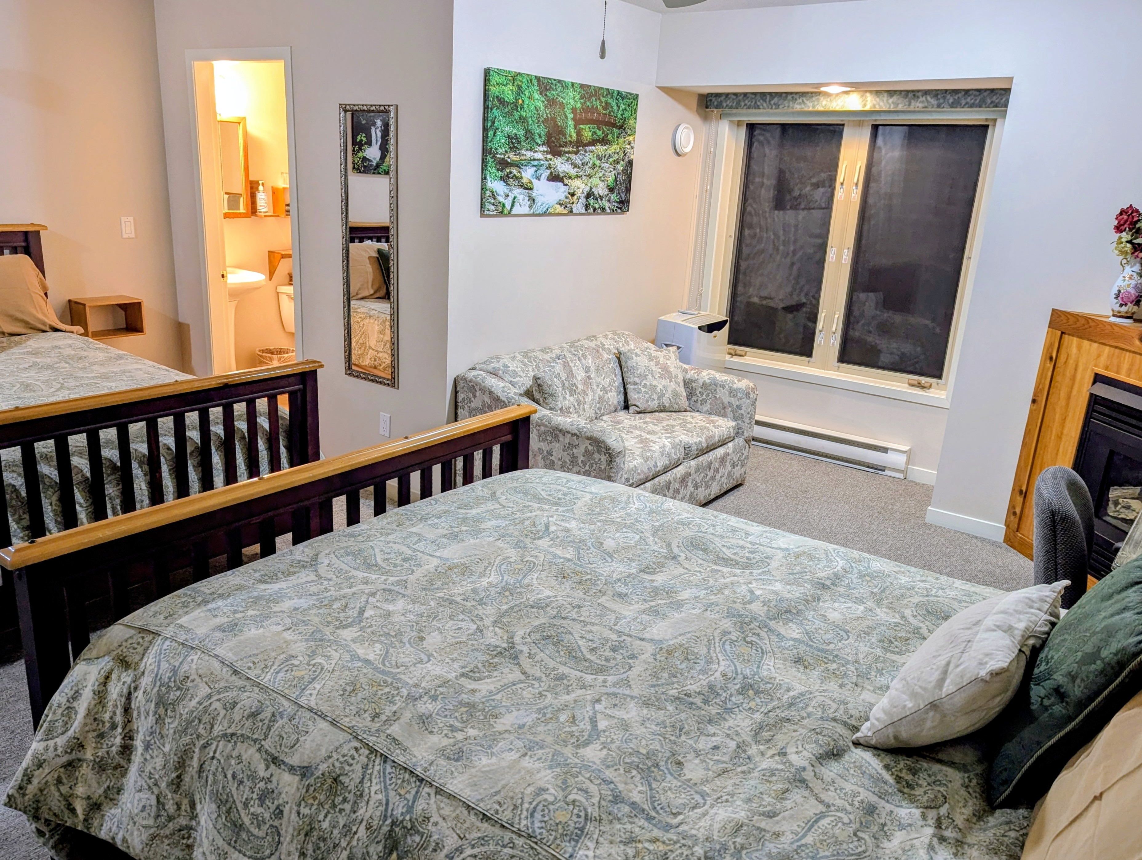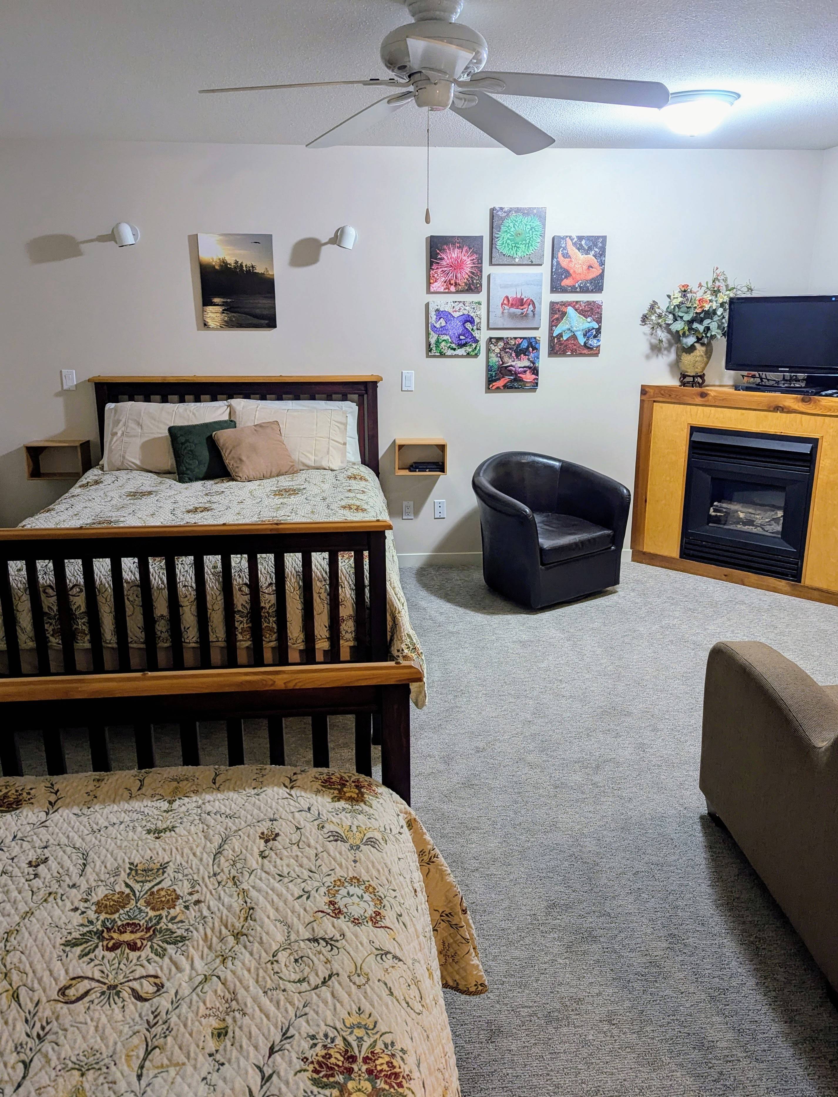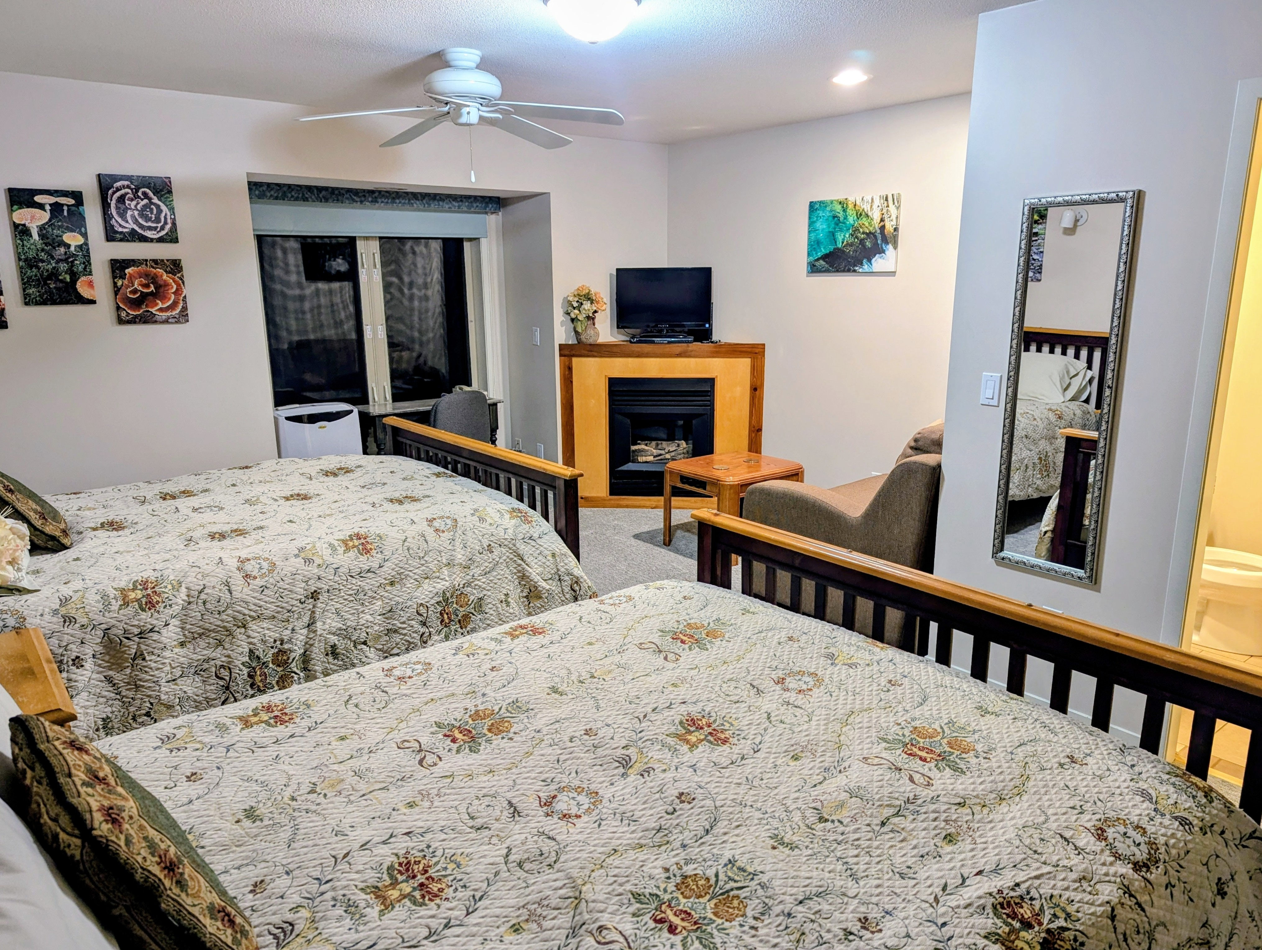 1 Queen Bed adorned in a goose-down duvet.  30inch Flatscreen HDTV with free DVD movies. Cozy natural gas fireplace and deluxe air-conditioning. Steno desk with Free High-Speed Wireless Internet.